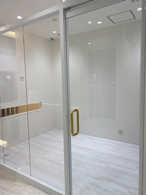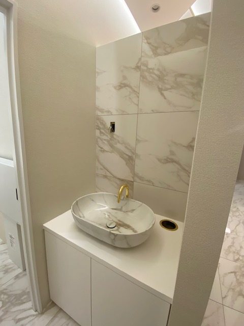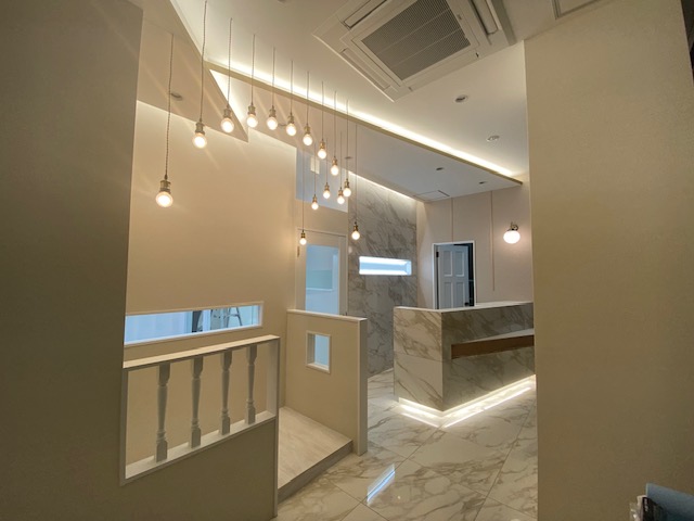 大理石柄の床をメインに白いクロスを使い高級感のある内装になりました。照明をうまく使い、天井も立体的に作ることで、豪華な雰囲気ですね!